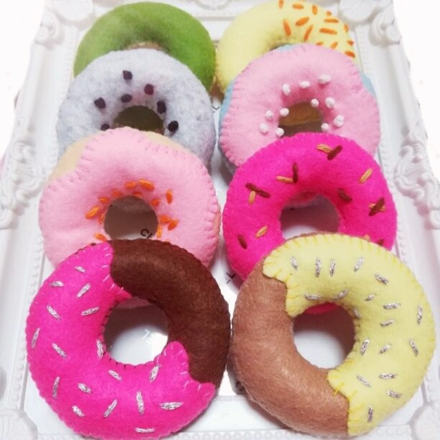 〈ドーナツセット③〉 *フェルト *綿 *糸 のみを使用して作成した お子様にも安心して遊んで頂ける フェルトままごとのセットです 手洗い可能* とっても可愛いミニドーナッツのセット(^-^) 約7~8cmの手のひらサイズで作成☆ 8点セットで販売です! ひとつひとつ丁寧に作成しておりますが ハンドメイドなので手縫いのバラつきなど ご理解ある方のみご購入お願いします(^-^) #知育玩具 #フェルトままごと #ドーナツ #デザート #おもちゃ #出産祝い #誕生日プレゼント #プレゼント